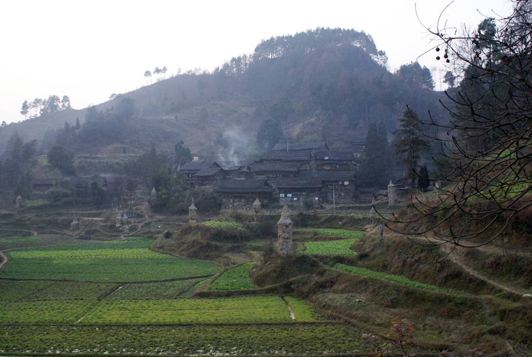 水族擇宜而居的傳統(tǒng)聚落環(huán)境多依山就勢(shì)?;蛟S真因?yàn)樗迕窬哟蠖嘁郎桨?,所以才被稱為水族(其先民原本就是從色江流域遷移過來的)。水族鄉(xiāng)村聚落多為鞍狀村落,多沿等高線布局。舊時(shí)水族村寨普遍存在寨墻,起到保護(hù)村寨的作用。目前只有少部分村寨保存完好。聚落內(nèi)部邊界多以建筑、曬場(chǎng)、院落等人工建成的區(qū)域圍合而成?,F(xiàn)在的水族村寨外部邊界大都具有完備的寨墻和寨門,也有些村寨沒有明確的邊界,只是通過一些地形、水體或植物劃分空間。