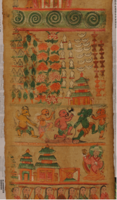納西族東巴教的長幅布卷畫,通稱為“神路圖”,它是東巴教繪畫中的巨作。此類畫一般長10-20米,寬1尺左右,有“古代宗教繪畫第一長卷”之譽。文化內涵異常豐富,在國際學術界被視為宗教繪畫一絕。如今,此畫已成稀有之物。很少見到尚留存民間的神路圖了?!吧衤贰敝鉃闁|巴為死者評斷、指點通往神地之路,把他們從地獄的煎熬中解脫超度出來,轉生為人,送至神靈之地。在納西族的喪葬和超度亡靈儀式上,根據(jù)神路圖導引死者靈魂進入新的生命場是一件極為重要的大事。到時,要把神路圖展開,眾東巴站于圖旁依次詠誦8冊《神路圖經》,為死者評斷路徑,導引亡靈穿越鬼地;擺脫惡鬼的種種折磨。在納西族實行傳統(tǒng)安葬習俗時,要在安葬場鋪開神路圖,把圖上的鬼地部分朝著死者頭部,向東北方向鋪開。往東北方向鋪的意思是死者靈魂將回歸東北方向的納西遠祖之地。把死者靈魂送到“祖先之地”是納西族的古代民俗。各地納西族都有十分詳細的送魂路線,靈魂返祖地必經的每一個地名都在口傳和寫于東巴經的送魂路線中標出。其畫面所繪鬼神人三界有數(shù)百個人神鬼獸的形象和很多具有宗教象征意義的物象,有佛像、神像、各種動物神,七八十個奇禽異獸以及東巴跳神的舞蹈布局,畫卷內容以靈魂不滅,因果報應,生死輪回等佛教信條為指導,用連續(xù)性和富有戲劇性的畫面表現(xiàn)人死后亡魂不滅。