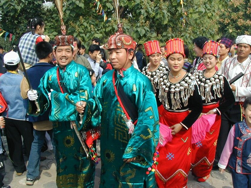 目瑙節(jié):又稱“總戈”,景頗語(yǔ)音譯,意思是“大伙跳舞”。目瑙節(jié)是景頗族最盛大的傳統(tǒng)節(jié)日,一般于每年農(nóng)歷正月十五以后的九天內(nèi)擇雙日舉行,節(jié)期三至五天不等。目瑙作為一種大型的群眾性歌舞活動(dòng),由來(lái)已久,歷史上,每逢豐年,出征、凱旋、婚姻嫁娶、敬祭鬼神等重要活動(dòng),均要跳“目瑙”。景頗族的“目瑙縱歌”原來(lái)是一種融宗教和文化習(xí)俗為一體的傳統(tǒng)慶典。隨著社會(huì)的發(fā)展,逐漸演化為各種不同類別的“目瑙”。大致有以下幾種:①“歲目瑙”,家庭財(cái)源茂盛,人丁興旺時(shí)舉行;②“布當(dāng)目瑙”,征戰(zhàn)取得勝利時(shí)舉行;③“貢冉目瑙”,同胞兄弟分家自立門戶時(shí)舉行;④“騰肯目瑙”,新建房屋住所落成時(shí)舉行;⑤“空然目瑙”貴族家娶親辦婚禮時(shí)舉行;⑥“達(dá)如目瑙”,出征時(shí)舉行;⑦“昔目瑙”,有名望的長(zhǎng)者去世送葬時(shí)舉行;⑧“柱目瑙”,祭奠“木代”神時(shí)舉行。不同類別的“目瑙”都有特定的內(nèi)容和表現(xiàn)形式,但有一個(gè)共同點(diǎn)就是整個(gè)過(guò)程都是由“瑙雙”(領(lǐng)舞)隊(duì)和“瑙巴”(表演)隊(duì)組成的舞隊(duì)來(lái)表現(xiàn)和完成的。每逢目瑙節(jié)日,村村寨寨的景頗人身著節(jié)日盛裝,紛紛從四面八方涌入目瑙廣場(chǎng)。廣場(chǎng)上人山人海,氣氛熱烈歡快而不失莊嚴(yán)古樸的特色。廣場(chǎng)中央高豎著四根長(zhǎng)約4米的目瑙柱,亦稱雌雄柱,中間兩根為陰,外面兩根為陽(yáng),上面皆繪有精美而富有象征意義的圖案:右邊柱上往往繪以蕨菜花紋,象征團(tuán)結(jié)奮進(jìn);左邊常畫回紋構(gòu)成若干個(gè)四方形,并涂以不同顏色,表示景頗族的遷徙路線;中間兩根柱子之間,交叉著兩把長(zhǎng)刀,為景頗民族驍勇強(qiáng)悍、堅(jiān)強(qiáng)剛毅性格的具體標(biāo)志。目瑙柱的左側(cè)立著一個(gè)方形架子,上層是吹嗩吶的座位;前面掛著一個(gè)兩米長(zhǎng)的大皮鼓和一面直徑一米多的大芒鑼,供跳舞時(shí)伴奏用。廣場(chǎng)四周用竹籬笆圍起,目的是為了防止野鬼的侵入和牲畜的干擾。舞蹈開始時(shí),鼓樂齊鳴,由兩位德高望重且又熟悉目瑙舞路線的老人身穿大龍袍,頭戴飾有孔雀、野雞羽毛和野豬牙齒的目腦帽,手持長(zhǎng)刀領(lǐng)頭,后面跟著背銅炮和持長(zhǎng)刀的隊(duì)伍,婦女們拿著扇子或彩帕跟在最后,邊歌邊舞,熱鬧非凡。參舞者少則百多人,多則幾千人,從清晨到日暮,以日暮到清晨,通宵達(dá)旦,其間舞者跳累時(shí)可自動(dòng)退場(chǎng)小歇片刻,然后繼續(xù)登場(chǎng)舞蹈。“目瑙縱歌”作為一個(gè)民族的傳統(tǒng)活動(dòng)發(fā)展至今,宗教色彩和類別已日益淡化,它已成為景頗族約定俗成的傳統(tǒng)節(jié)日,統(tǒng)稱為“統(tǒng)肯(傳統(tǒng))目瑙”并賦予了新的內(nèi)涵,其內(nèi)容和形式都是展示一個(gè)民族的傳統(tǒng)文化,反映今天的新生活和對(duì)未來(lái)的美好向往。