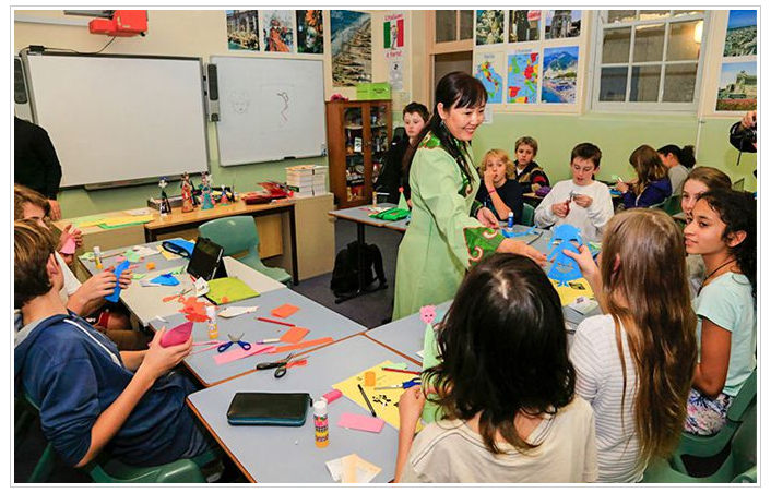 2014年7月,蘇梅把精美絕倫的“哈尼卡”剪紙藝術(shù)帶給了澳大利亞悉尼莫斯曼中學的學生們 (賀吉 攝影)