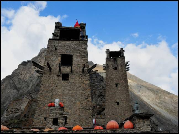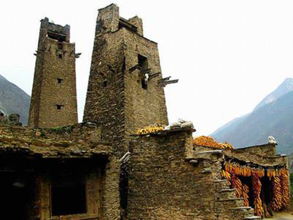 在羌語中,碉樓被稱為“邛籠”,意為美麗、高貴的房子,早在2000年前《后漢書·西南夷傳》就有羌族人“依山居止,壘石為屋,高者至十余丈”的記載。碉樓的高度在十米至三十米之間,用于御敵、貯存糧食和柴草。碉樓有四角、六角、八角幾形式,有的高達(dá)十三四層。建筑材料是石片和黃泥土,墻基深1.35米,以石片砌成。石墻內(nèi)側(cè)與地面垂直,外側(cè)由下而上向內(nèi)稍傾斜。修建時不繪圖、吊線、柱架支撐,全憑高超的技藝與經(jīng)驗(yàn)。建筑穩(wěn)固牢靠,經(jīng)久不衰。自唐朝來,羌族人民因各種原因向西北遷移,到了西藏和青海,所以現(xiàn)在,羌族碉樓也往往被稱為藏族碉樓。