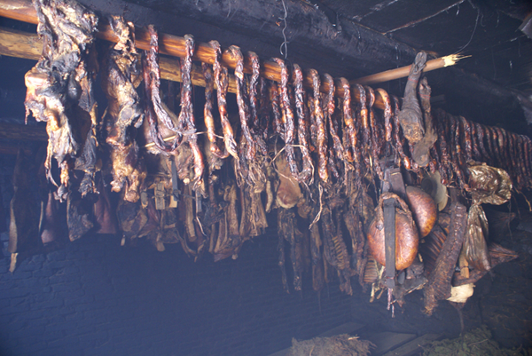 羌族通常一年宰殺一次豬,所以除了剛剛宰殺的那幾天能吃到鮮肉外,平時(shí)很少食用。每年冬月殺豬后均將豬肉切割、抹鹽、煙熏,腌制成臘肉。豬油也在抹鹽后,用兩個(gè)木夾夾壓成餅狀,隨吃隨煉。同時(shí)也取部分瘦肉切碎,拌上作料,灌入洗凈的豬小腸內(nèi)制成香腸。羌族還常把新鮮的豬骨頭砍成小塊,然后抹上鹽、花椒、姜、蒜、蔥等,放進(jìn)豬的胃囊里,扎緊、風(fēng)干,掛在火塘上用煙熏,制成豬肚骨頭,久存不壞。