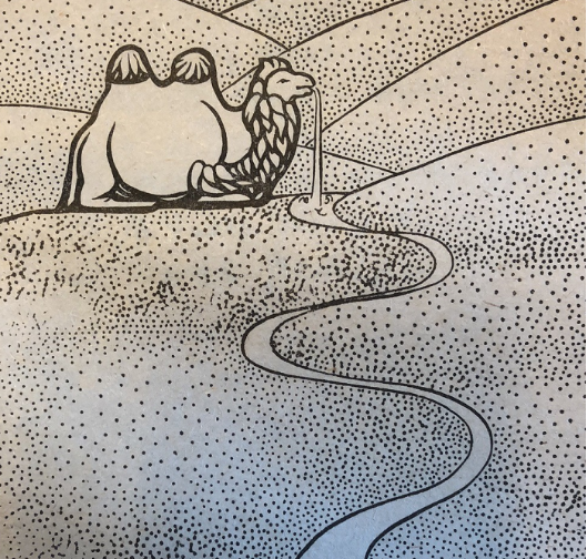 高興之際,大家想起了馱經(jīng)馱水土的駱駝;但是人們四下里一看,白駱駝不見了。真是,為了找水喝竟把勞苦功高的駱駝丟失了!大家找呀,找呀,找了一夜還沒找到,天亮?xí)r,又回到燒茶的地方,然后順?biāo)?,繼續(xù)尋找。走不多遠(yuǎn),發(fā)現(xiàn)駱駝在前面靜靜地臥著,人們高興極了,有一個人三步兩步跑上去拉駱駝,可是駱駝一動也不動。眾人上前詳細(xì)一看,白駱駝已變成了石頭。那石駱駝在水里臥著,一股清水從它的嘴里噴出來,散發(fā)看清香的氣味,流向遠(yuǎn)方。