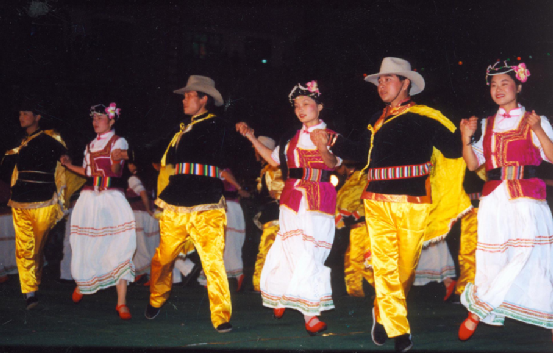普米族的民間娛樂舞蹈,普遍具有歌、舞、樂三位一體的特點。舞蹈形式正如普米族民歌所唱的:“如金線把珍珠穿成一串,手拉手跳成十五的月亮?!眾蕵肺璧溉鞘掷洲D圓圈的舞蹈形式。人們挽手而跳,伴以高亢洪亮、情感激越的唱詞。特別是普米族婦女雪白的長裙隨舞步輕盈飄旋,似白鷺翻飛,正如《打跳歌》中所唱的:“笛聲不停莫歇腳,舞場上沒有陡巖子,腳底板下沒有刺,跳它個地動山也搖?!痹谙矐c的集會之夜,歡快的娛樂性舞蹈,往往一跳就是通宵達旦。跳鍋莊是普米族傳統(tǒng)的舞跳形式,這種舞蹈不受時間空間的限制,只要一支竹笛或葫蘆笙,有一塊空地即可進行,少則三五人,多則數(shù)百人。一般總是在傍晚,在院內或場壩上舉行。跳舞時,總要在中間燃起一堆火,與室內的鍋莊相似,所以稱之為鍋莊舞。鍋樁內容很豐富,從古代的游牧、狩獵、紡織到今天的趕街、慶豐收、烤酒等都有反映。流行的曲調有《放單調》《出山》《獅子舞》等等?,F(xiàn)在,鍋莊舞已發(fā)展成為集唱詞、曲調、舞蹈、音樂于一體的綜合性歌舞藝術。