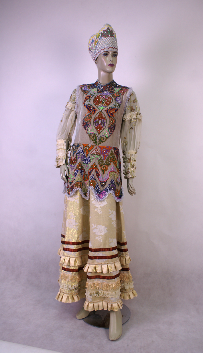 俄羅斯族女性的服飾則更多的體現(xiàn)了女性美,她們?cè)谥卮蠊?jié)慶或節(jié)日時(shí)會(huì)穿上絲綢質(zhì)地的繡花襯衣,外面再套穿一件無(wú)袖、腰身較高的對(duì)襟長(zhǎng)衫,下身一般穿著毛織長(zhǎng)裙。俄羅斯族女子也十分喜愛穿長(zhǎng)筒皮靴或氈靴。俄羅斯族女性的發(fā)飾也視年齡的不同而有所差異,少女梳獨(dú)辮,把彩色發(fā)帶和小玻璃球編在辮子里,頭發(fā)可外露。已婚婦女則梳兩條辮子,盤于頭頂,再用頭巾或帽子罩上。