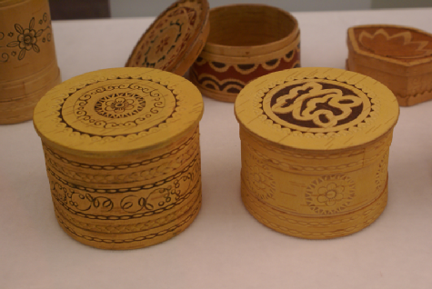 鄂溫克族的雕刻包括骨刻、木刻與樺樹皮刻。骨刻的工具是鐵制刻刀。骨刻制品一般有筷子、衣扣、板指、使用馴鹿時(shí)所用鞍子的配件、縫衣物時(shí)為拉緊線而用的拉線棒等,不同的用具上刻有不同的花紋。木刻的工具也是鐵制刻刀。木刻一般多用于神像、刀柄、煙鍋和白樺木制的馴鹿鞍具、背夾上。一般的花紋有“奧豪爾”,這種花紋有勾有彎,仿松樹形狀,有馴鹿不會(huì)跑掉的意思。背夾上的花紋則是犭罕 、馴鹿、松鼠、天鵝等。樺樹皮雕的工具用犭罕骨制成的刀,分二、三、四齒幾種。雕刻時(shí),先用小刀或錐子把圖案輕輕畫在樺樹皮上,再用犭罕骨刻刀耐心地刻出花紋圖案。圖案一般有云卷紋、菱形紋、水波紋、花鳥等。用顏料涂上藍(lán)、紅色,使圖案呈現(xiàn)出色彩對比和立體感。鄂溫克族樺樹皮制品有盆、碗、盒、桶、箱等多種多樣,其制品本身就是非常古樸風(fēng)雅的藝術(shù)品,再雕刻上各種花紋圖案,倍添精致、美觀。