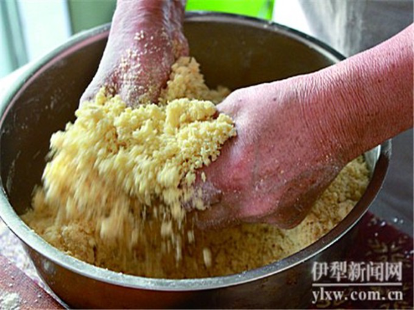 拜列西的做法有很多種,其中以用羊肉、洋蔥、土豆或南瓜為主要食材的伊提拜列西(肉拜列西)和以蘋果為食材的阿勒瑪拜列西(蘋果拜列西)為主。羊肉切薄片,土豆切小方塊,洋蔥切丁,倒在一起,擱置一旁,開始和面。和面是制作拜列西過程中一項至關(guān)重要的環(huán)節(jié),面和得好壞直接會影響到烤出來的拜列西的美觀程度和口感的酥脆程度。