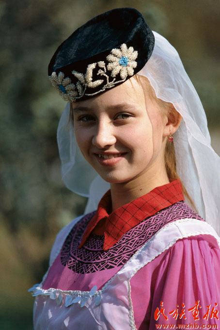 塔塔爾族的婚俗別具一格。按塔塔爾人的傳統(tǒng)習(xí)慣,婚禮在新娘家舉行,即先把新郎“嫁”出去,然后再“娶”回來(lái)?;橐鲞^(guò)程主要經(jīng)歷提親、相親、訂婚、納聘、嫁新郎、娶新娘六個(gè)過(guò)程(塔塔爾族少女。引自民族畫(huà)報(bào))。