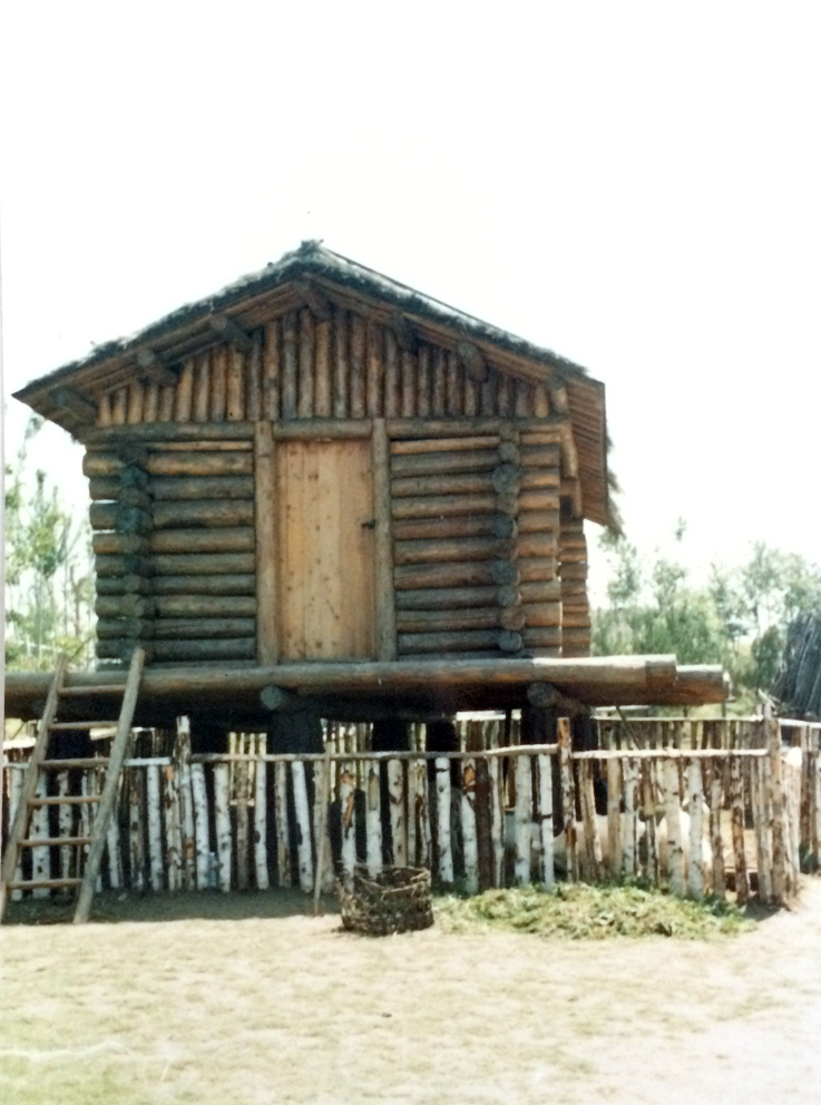 早期,每一個家族公社都有一個公用的高腳倉庫,鄂倫春語叫“歐倫”,一般是在游獵的中心地帶,選擇四棵自然生長、成對角的樹,在距地面約3—4米高的地方留一個樹杈,砍掉其余的樹頭,樹杈上架兩根直樹干,樹干上面一根挨一根地平鋪木桿成為底座,底座上用木桿壘一個“木刻楞”小房或用樹枝做一個半圓形的架子,覆蓋樺樹皮,然后用藤條或樹皮綁縛固定。一側留有進出的小門,借助木梯上下,為防止野獸攀上糟蹋東西,平時都把木梯放倒在一邊。這種倉庫主要存放一些暫時吃不了和用不著的食品和雜物,搬遷時不拆除,里面的東西也不帶走,什么時候需要再騎馬來取。個體小家庭獨立以后,公共庫房變成了私家財產。雖說是私家財產,卻從不留人看守,也不上鎖。獵人在外打獵,如果一時斷糧,可以不經主人允許,隨便到任何一家的“歐倫”中拿走所需要的東西,事后向主人通告一聲即可,以后有了如數(shù)奉還,不還主人也不索要。