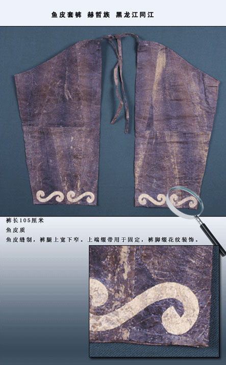 套褲的形式只是兩個(gè)筒形褲腿,沒(méi)有褲腰,男式的上端為齊口,女式的上端為斜口。赫哲族人稱男式魚(yú)皮套褲為 “臥又克衣”,褲邊口有皮條,是用來(lái)扎結(jié)用的。赫哲族人稱女式魚(yú)皮套褲為“嘎榮”,口呈月牙形狀,前邊到腰部,后邊到大腿根部。如圖所示,女式魚(yú)皮套褲,長(zhǎng)105厘米,褲腿上寬下窄,上端系有綴帶,褲腳綴有“S”形紋飾。魚(yú)皮褲造型與普通褲子基本一致,褲腰和褲襠部較為寬松肥大,褲腿稍窄些。