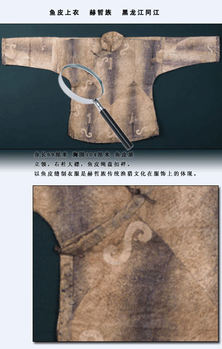 赫哲族的魚(yú)皮衣歷史久遠(yuǎn)。我國(guó)古代文獻(xiàn)《山海經(jīng)》第九卷《海外東經(jīng)》中便有“玄股之國(guó),在其(黑齒)北,其為人衣魚(yú)食鷗” 的記載?!耙卖~(yú)”西晉學(xué)者郭璞解釋為“以魚(yú)皮為衣也?!闭f(shuō)明早在兩千多年前,赫哲族的先民就已使用魚(yú)皮做衣服了。另?yè)?jù)密山新開(kāi)流新石器時(shí)代遺址中出土的魚(yú)叉及骨針,證明赫哲族的先民捕魚(yú)和縫制魚(yú)皮衣有數(shù)千年歷史了。清代張晉彥的《寧古塔山水記》有:“魚(yú)皮部落,食魚(yú)為生,不種五谷,以魚(yú)皮為衣,暖如牛皮”的記載。《皇清職貢圖》記載:“赫哲衣服多用魚(yú)皮而緣以色布,邊綴銅鈴,亦與鎧甲相似。”另外,地方志書(shū)對(duì)此也多有記載??梢?jiàn),赫哲族制作和穿著魚(yú)皮衣是真實(shí)而久遠(yuǎn)的。