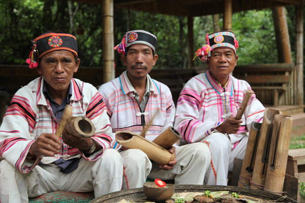 男子身著無(wú)領(lǐng)對(duì)襟上衣,多用白底直條紋土布制成,背部縫有繡在白色方塊布上的月亮花圖案。下穿寬大的褲子,長(zhǎng)及膝處,用白色土布綁腿。頭上留三撮發(fā),額前正中一撮,頭頂腦門心兩邊各一撮,但有的村寨只留一撮,有的在額正中,有的在頭頂上,長(zhǎng)約寸許,用寬一尺、長(zhǎng)丈余的黑布纏頭。