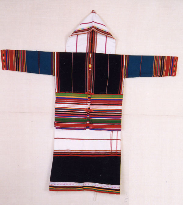 基諾族婦女上衣為無(wú)領(lǐng)對(duì)開,上半部多采用黑布或白布,下半部及衣袖用紅、藍(lán)、黃、白等7色布配制或刺繡而成,用紅色鑲邊,上衣背部縫一塊約3寸見(jiàn)方的白布,上面繡有圓形太陽(yáng)花式圖案(基諾族稱月亮花);內(nèi)衣為上部呈方形下呈菱形的兜肚式緊身衣,上部方形為鮮艷的條飾花紋,下部菱形繡著各式圖案。下身多著紅色鑲邊的黑色合縫短裙,并用一尺左右的黑布纏綁小腿。發(fā)型為椎髻,婚前髻在腦后右方,婚后髻在前額正中。頭戴披風(fēng)式尖帽,這種尖帽用長(zhǎng)約60公分、寬23公分的豎線花紋土布對(duì)折,縫住其一邊而成,戴時(shí)又在帽沿上折起一指許的一道邊。