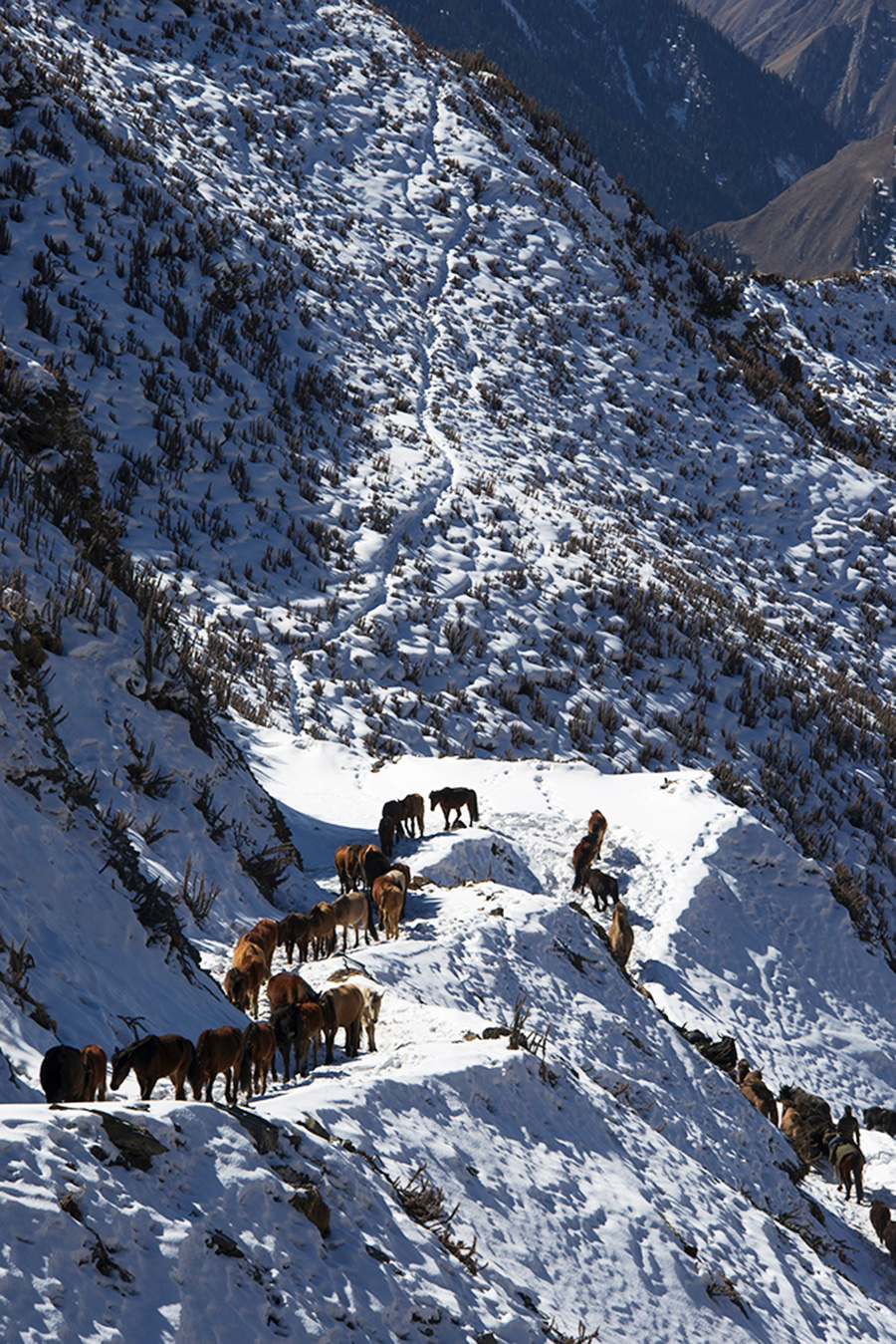 喬隆格爾冬牧場(chǎng)與山外的氣候差異大,暖陽(yáng)如春。另一個(gè)突出特點(diǎn)是草好,草密的地方?jīng)]膝,縱橫倒伏一片,比南方秋田摞在一起的蒲草都密實(shí)。空氣清洌,腐草味兒、上一年遺留的畜糞味兒和著遠(yuǎn)處高大冰崖透散過(guò)來(lái)的寒氣撲面而來(lái),最突出的還有野生動(dòng)物的腥氣,牧羊犬夜夜不停地叫聲在告訴你它們往復(fù)經(jīng)過(guò)的頻率。山上能看到大角的北山羊,野鵪鶉被驚到嘩啦啦地飛起一片。若是誰(shuí)家的羊死了扔在野外,幾天都能看到禿鷲在天空盤旋。最不可思議的是雪豹,光顧一次造成的損失遠(yuǎn)比一群狼大。