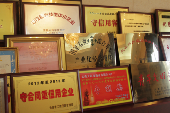 十幾年的風雨兼程,太陽魂酒業(yè)有限公司榮膺多項殊榮,先后獲得“云南省農(nóng)業(yè)產(chǎn)業(yè)化省級龍頭企業(yè)”、“云南省農(nóng)產(chǎn)品加工重點企業(yè)”、“全國休閑農(nóng)業(yè)與鄉(xiāng)村旅游示范點”、“云南省著名商標”、“云南省省級企業(yè)技術(shù)中心”、“2009中國(昆明)酒業(yè)發(fā)展高峰論壇暨新中國60周年云南酒業(yè)十大功勛品牌”及“云南酒類消費市場十大最具成長性品牌”、“云南省接待用酒”等榮譽稱號。已獲得QS認證、ISO9001認證,HACCP認證等高標準企業(yè)資格證書。產(chǎn)品質(zhì)量達到國內(nèi)先進水平,釀制的“赤霞珠”葡萄酒獲2006年亞洲葡萄酒質(zhì)量大賽金獎、北京國際葡萄酒暨烈酒挑戰(zhàn)賽銅獎和第八屆中國國際葡萄酒及烈酒評酒會上榮獲銀獎,梅里圣地冰酒榮獲2006年亞洲葡萄酒大賽銀獎、2012年亞洲質(zhì)量大賽金獎及領(lǐng)袖產(chǎn)區(qū)代表產(chǎn)品。朗姆酒2011年榮獲“2011中國(蓬萊)國際葡萄酒?烈酒品評賽”銀獎。2011年國際釀酒師葡萄酒烈酒大賽中獲得銀獎,2012年獲得國際釀酒師葡萄酒烈酒大賽金獎。2012年,公司釀造的赤霞珠產(chǎn)品被法國勃艮第大學葡萄酒學院指定為教學用酒。2013年7月,“梅里圣地赤霞珠冰酒”榮獲2013中國優(yōu)質(zhì)葡萄酒挑戰(zhàn)賽金獎。同時,公司位于德欽產(chǎn)區(qū)的干紅及冰酒已通過有機產(chǎn)品認證。2014年“2012梅里冰酒”榮獲國際領(lǐng)袖產(chǎn)葡萄酒(中國)質(zhì)量大賽優(yōu)質(zhì)獎,拍品價格1萬元。