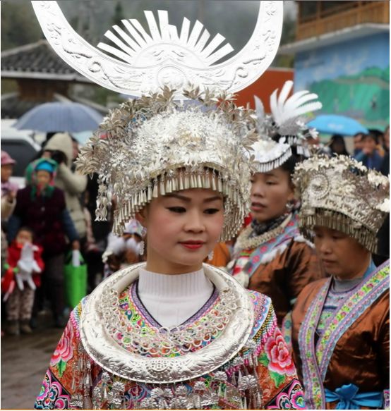苗族頭飾主要是以銀飾為主。苗族女孩從學會走路開始,父母就會給女兒制作一套苗族民族盛裝和頭飾,苗族女孩一般6歲左右就可以參加每年的民族盛會,并且從小學習化妝技術。苗族的盛會主要集中在春節(jié)后,也叫坡會,就是山坡上的聚會,這一天苗族姑娘就會穿上珍藏已久的民族盛裝,戴上頭飾,把自己打扮的漂漂亮亮,參加蘆笙踩堂舞,展示自己的美麗一面。
