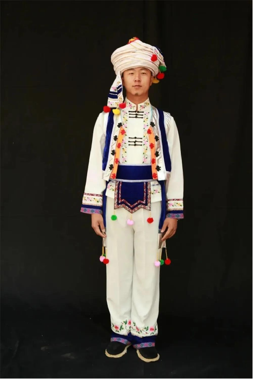 白族有著尚白的傳統(tǒng),白族男子喜纏白色或藍(lán)色包頭,多穿白色對(duì)襟上衣,外套黑領(lǐng)褂,下身穿寬筒褲,系拖須褲帶,腳穿剪刀口布鞋,有的還佩帶繡有美麗圖案的掛包,顯得敦厚英俊,灑脫大方。