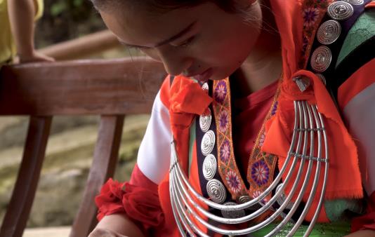 谷灑村苗族服飾上的圖案,呈現(xiàn)多元化的風(fēng)格,這是因?yàn)槊缱迮拥姆椡汲鲎运齻冏约旱氖种?,每件服飾都有著個(gè)人風(fēng)格。谷灑村苗族喜歡在古井的涼亭上刺繡,這里涼風(fēng)習(xí)習(xí),是她們納涼刺繡最好不過的地方。同伴坐在一起,這樣以便于互相指點(diǎn),學(xué)習(xí)對方的長處、彌補(bǔ)自己的短處。