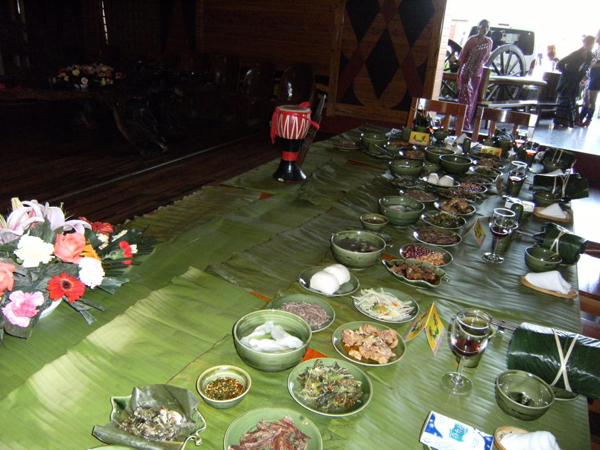 景頗族飲食大多帶有亞熱帶山林地區(qū)的特色和耕牧漁獵的民族文化氣息,如舂鱔魚(yú)、螺螄湯、酸筍燒魚(yú)、竹筒烤魚(yú)、砂鍋燉竹鼠、涼拌牛肚、煮芋頭、臭豆、酸木瓜炒牛肉絲、帕滾菜煮繁雞、水腌菜拌烤山鴿、鹿肉剁生、馬鹿干巴肉松、油炸知了肉丸、螃蟹夾、粘棗果、煮酸粑菜、軟米銅鍋飯等。特色菜酸筍燒魚(yú)烹飪時(shí)先將油燒至七成熱,放入洗凈去鰓的魚(yú),炸至呈金黃色撈出控油。然后又在鍋中注入油,用蔥、姜、蒜熗鍋,烹入料酒、醬油、高湯,沸后下魚(yú)、酸筍、辣椒、味精、鹽、白糖、胡椒,收至汁濃時(shí)裝盤(pán)。舂鱔魚(yú)將鱔魚(yú)去頭去內(nèi)臟,蒜、姜拍松,香菜、荊芥切成末,鱔魚(yú)用炭栗火燒成金黃色,辣椒炒熟透,切成米粒。最后將鱔魚(yú)舂細(xì),放入配料,調(diào)料舂細(xì)裝盤(pán)。