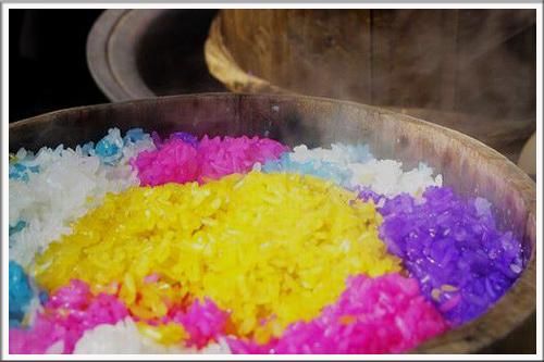 節(jié)日之前,苗族婦女就從山上采集楓葉和野榛葉,用鐵鍋煮開,倒進盆子,冷卻后,將白花花的糯米放入盆子浸泡。節(jié)日當天早上,苗族婦女們早早起來,將裝有染色糯米的木箕放在三腳架的鐵鍋上,燒起火慢慢地蒸。約一個小時過后,木箕里的糯米蒸熟成糯米飯,散發(fā)滿屋的芳香。這時,苗族婦女就將糯米飯倒進飯盆,用手前后翻轉,直到糯米飯里的水蒸氣全部散發(fā)。