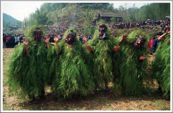 苗族芒篙的固定形象,是面帶古怪的木儺面具,身披齊膝的虎臥藤,手持過頭的竹棍,小腹前掛著長長的象征男性生殖器之物,它們單數(shù)組合,多為11——15個。