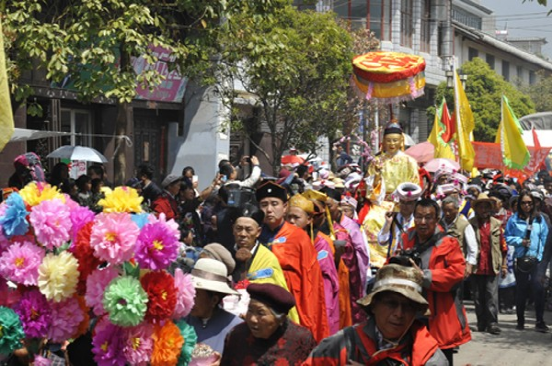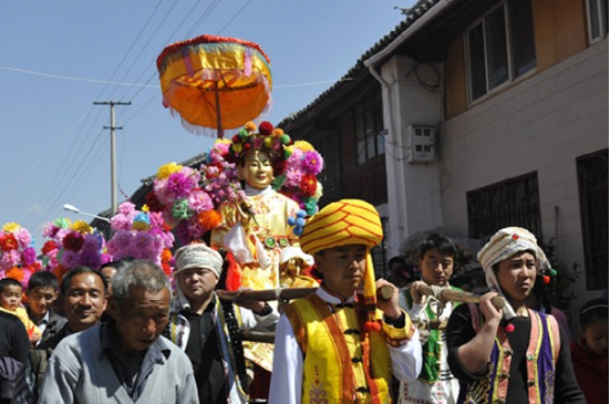農(nóng)歷二月初六,迎太子入城。這一天在佛教徒的帶領下,人們焚香沐浴,衣冠整齊,虔誠地將“太子”(用布扎油漆制成的太子行像)請到行宮或本主廟里。這一年的新郎為太子抬轎,希望能得到太子的保佑而使新婚的妻子孕生男兒。