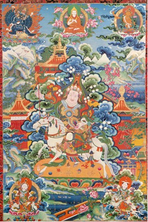 勉塘畫(huà)派是15世紀(jì)以后影響最大的繪畫(huà)流派,主要流行于衛(wèi)藏地區(qū)及昌都部分地區(qū)。該畫(huà)派的創(chuàng)始人是勉拉頓珠,他出生于洛扎勉塘(今山南地區(qū)),勉塘畫(huà)派由此而得名。他大約出生于公元十五世紀(jì)20年代或30年代。據(jù)史料記載,勉拉頓珠出生的時(shí)間正好與他家鄉(xiāng)發(fā)現(xiàn)了朱砂礦的時(shí)間一致。這種重要繪畫(huà)顏料的出現(xiàn),預(yù)示著一代繪畫(huà)大師降臨人世。他自幼聰慧,毫不費(fèi)力地學(xué)完各種字體的書(shū)寫(xiě)、大小五明中的絕大多數(shù)內(nèi)容。成年后,拜后藏一帶的著名美術(shù)大師多巴扎西杰布為師,苦心鉆研,在繪畫(huà)藝術(shù)領(lǐng)域取得了很深的造詣。通曉了藏、漢、印、尼泊爾等各種繪畫(huà)派別的技法,他根據(jù)《續(xù)部》等編寫(xiě)了繪畫(huà)理論專著《造像量度如意寶》,并創(chuàng)立了勉塘畫(huà)派。他參與了一世達(dá)賴?yán)锔刂彀团c1447年創(chuàng)建的扎什倫布寺措欽大殿壁畫(huà)繪制工程的全過(guò)程,單獨(dú)完成了北壁的《釋迦牟尼與十六羅漢圖》與《八十大成就者環(huán)圍金剛持》兩幅壁畫(huà),在西壁勉拉頓珠親手繪制了《釋迦牟尼十二宏化圖》的白描部分。另外在該寺以及同時(shí)代建造的諸多廟宇繪制完成了大量的壁畫(huà)、巨幅堆秀唐卡及小型唐卡。其中最負(fù)盛名的是扎什倫布寺的巨幅堆秀唐卡《釋迦牟尼》,其大小約為長(zhǎng)32.9米、 寬19.3米。該畫(huà)派造像法度精嚴(yán),與傳統(tǒng)的表現(xiàn)手法相比,尤其注重線條的運(yùn)用,線條工整流暢,色調(diào)活潑鮮亮,變化豐富,人物體態(tài)、骨相和肌膚都異常完美,脖頸較長(zhǎng),高度和諧的色彩和色調(diào)的配制十分突出。畫(huà)面暈染充分,用色細(xì)膩、柔和、富麗堂皇。由于石青和石綠色突出,從遠(yuǎn)處看,繪畫(huà)作品十分優(yōu)美和靜。衣袍和飾帶呈不對(duì)稱形式,棋格使構(gòu)圖消失,諸神位于云端風(fēng)景之中,布局活躍多變,背光中卷草圖案等變成了波浪式放射的金線,該派擅長(zhǎng)表現(xiàn)和靜類神像。
