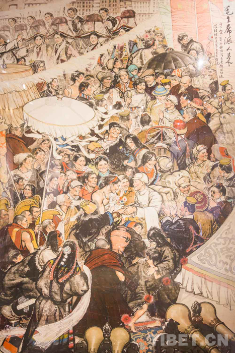 鑒賞展現(xiàn)場,不少前來參觀的畫家都是韓書力的學(xué)生或在一定時期曾受其教導(dǎo)?!?973年,我在西藏自治區(qū)展覽館見到了韓書力老師,第一次見面我就拜了師。我們一起下鄉(xiāng),我就給他當(dāng)導(dǎo)游和翻譯。30幾年來,我一直在學(xué)習(xí)韓老師的繪畫技法,到現(xiàn)在還是他的學(xué)生。韓老師創(chuàng)作《毛主席派人來》時,我就跟在旁邊學(xué)習(xí)。學(xué)到了一些創(chuàng)作獨(dú)幅作品的技巧和手法,讓我受用至今?!蔽鞑厍嗄戤嫾矣嬅莱嗔姓f。