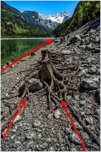 這個片子的興趣點是樹樁,樹樁根系和湖岸形成的引導(dǎo)線,把我們的目光從樹樁根系一直在往前推,一點點推到雪山,并不是跳躍性的看到雪山。觀者進入畫面是一個逐步的過程,是一直有引導(dǎo)線引導(dǎo)著你,最后看向了遠處的森林和雪山。