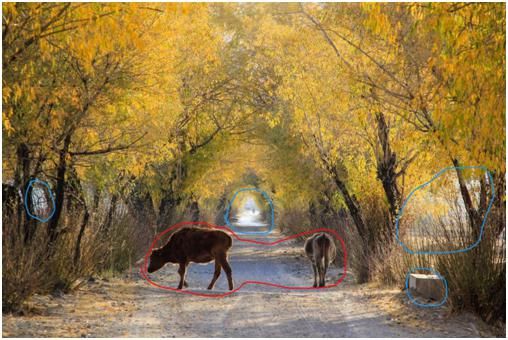 這幅片子用藍色部分標(biāo)注出來的地方,都是相對比較亮的有高光的地方,它們對照片中的主體(圈起的紅色部分),兩只牛形成了干擾,使得觀看者的目光不能集中在主體身上,總是被這幾個藍色高光部分所吸引。