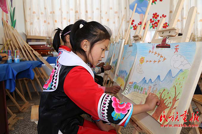 走進臘灣民族小學,濃郁的彝族文化撲面而來。在學校的操場上,學生們的課間操跳的是瑪咕舞?,敼疚杵鹪从谀捕h鳳屯鎮(zhèn)臘灣村,被譽為彝族文化的活化石,彝語意為老年人跳的左腳舞,習慣上稱為“老人舞”。臘灣民族小學根據(jù)瑪咕舞特點,編排出了瑪咕舞課間操。在彝族傳統(tǒng)民歌音樂背景下,孩子們圍成圈,步伐緩慢而優(yōu)雅。臘灣民族小學校長李發(fā)庭告訴記者:“臘灣瑪咕舞有約定成俗的規(guī)定:三胡聲不停止,四弦琴不彈奏,老人舞不上場,年輕人不能跳腳。長者在傳承弘揚彝族傳統(tǒng)文化的同時,我們還要將祖先尊老敬老的優(yōu)秀品質(zhì)告訴孩子們?!?/p>