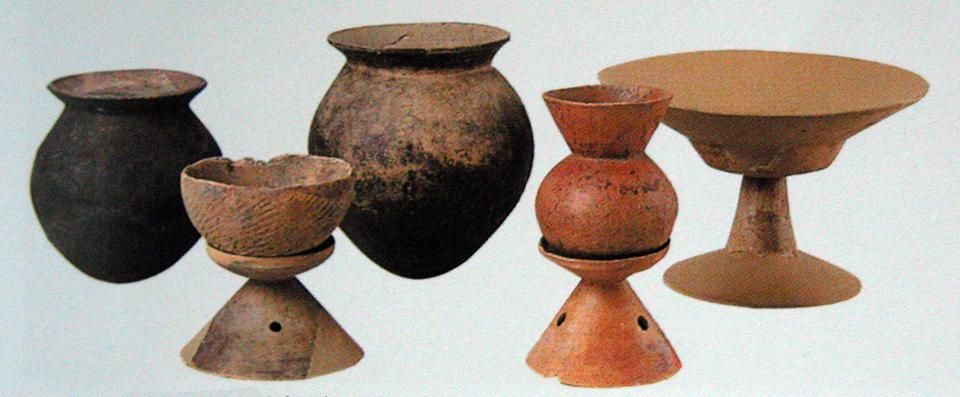 彌生時代的名稱,源自1884年東京市本鄉(xiāng)彌生町“彌生陶器”的發(fā)現(xiàn)。彌生陶器與繩紋陶器截然不同,為素面,灰色。日本人認為彌生陶器是“渡來人”制造的?!岸蓙砣恕笔侵袊箨懲ㄟ^朝鮮半島而來,他們帶來了陶器的制作技術(shù)。彌生陶器為深釜器,以甕形器、缽形器、高腳杯(豆形器)為主(圖五)。