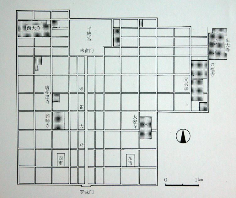 平城京在規(guī)模上繼承了藤原京,面積大致相同,東西約5.9km、南北約4.8km,其形制主要模仿唐長安城。全城平而呈長方形,宮城在北部中央。南面正中設(shè)象征性的都城正門——羅城門。羅城門與宮城的朱雀門相對,朱雀大路縱貫南北,全長約3.8km,寬72m。而此朱雀大路正好將全城分為東西兩部分,分別稱左京和右京。京城內(nèi)有里坊與商市(即東市和西市)。這些設(shè)置和街道的名稱都和唐長安一模一樣,但總體面積僅為唐長安城的四分之一(圖二十一)。