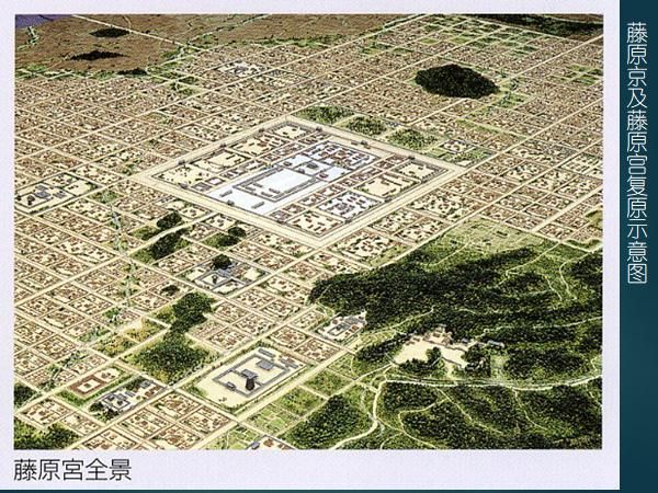 飛鳥-奈良時代對作為中央集權(quán)國家的象征的都城建設(shè),極其重視。藤原京是持統(tǒng)、元明、元正三代天皇延用了16年的都城遺址,這個遺址經(jīng)過幾十年的考古發(fā)掘,已經(jīng)探明了藤原京和藤原宮的范圍及布局(圖二十)。京城東西及南北各長5.3km,平面近正方形,宮城在其中央,這點與唐長安城不同。有學者認為,藤原京是以《周禮》規(guī)定的理想化都城建制為依據(jù)所筑成的。