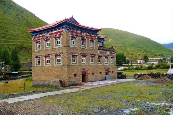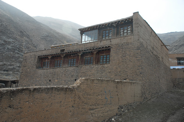 “碉院”則是一組較大的綜合性建筑,一般三層,局部四層,平面為四全院式,中間有較大的天井內(nèi)院,設(shè)小花壇,可種樹(shù)木花卉。內(nèi)院四周設(shè)回廊,石砌外墻用全封閉,除了門洞,墻上開(kāi)少量小窗。底層為牲畜圈、雜用房;二層多為倉(cāng)庫(kù)、接待房、傭工房等;三層為臥室、廚房和糧倉(cāng)、珍寶庫(kù);四層為經(jīng)堂、佛堂、經(jīng)書庫(kù)。有的在外墻女兒墻部分刷以黑色或棕色圓珠圖案,窗上檐一層或二層方椽挑出,作為傳統(tǒng)式藏窗形式,豐富了立面,改變了石墻面之笨拙感。