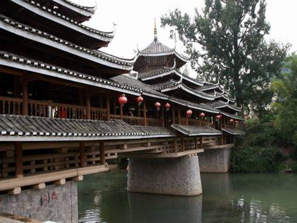 瑤族風(fēng)雨橋,又被稱之為“涼橋”或“風(fēng)水橋”。除木橋外,大多是在石拱橋上加蓋橋廊、橋亭和在橋頭的橋臺(tái)上建閣樓,穿斗式木構(gòu)架,二層檐或三層檐,有的四層檐,通高在9米~10米間。風(fēng)雨橋不僅是路人避雨之處,也是瑤族男女青年談情說愛的約會(huì)場(chǎng)所。廣西瑤族風(fēng)雨橋主要集中在富川瑤族自治縣和恭城瑤族自治縣。富川縣保存至今的古代瑤族風(fēng)雨橋有18座,其中著名的有迥瀾橋(建于明萬歷年間),青龍橋(與前者同時(shí)期修建),以及福壽橋、高橋、鳳溪新橋、皇侯泉橋、東轅橋、鸕鶿塘瀾通橋、龍歸橋、興隆橋等。