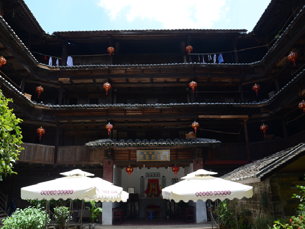 一座土樓就是一個藝術(shù)殿堂。每一座土樓,又如同一個“大家族,小社會”。土樓內(nèi),居住在同一屋頂下的幾十戶幾百人同祖同宗同血緣同家族,過著共門戶、共廳堂、共樓梯、共庭院、共水井的和睦生活。這種聚族同樓而居的生活模式,典型地反映了客家人的傳統(tǒng)家族倫理和家族的親和力。而且,樓內(nèi)的客家人,住著層數(shù)相同、開間面積相等、無明顯朝向差別、更無貴賤等級之分的均等居室。平等聚居,反映了客家人融洽和睦的家風(fēng)和平等團(tuán)結(jié)的傳統(tǒng)。