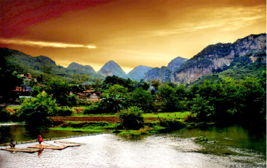 壩美,為壯語譯漢語為:壩—沖口,美—樹 ,因居住的沖口樹木多而得名。壩美村位于珠江流域西江水系馱娘江上游的阿科河畔。屬喀斯特地貌,區(qū)域內(nèi)山峰奇特,河谷幽美,阡陌縱橫,河流山泉蜿蜒奔流,溶洞層疊散布在山體峰內(nèi),冬無嚴(yán)寒,夏不酷暑,氣候宜人。因四面環(huán)山,不通公路,進(jìn)出寨子主要靠村前村后兩個(gè)天然的石灰溶巖水洞,村民們要摸著巖壁趟水、撐竹筏、劃獨(dú)木舟、坐小船,經(jīng)過950米長的幽暗的“出水洞”和680米長的“湯拿洞”才能進(jìn)出。由于地處偏僻,交通不便,基本不與外界交往,多年來壩美村長時(shí)期與外世隔絕。壩美村水源豐富,氣候溫和,自然生態(tài)環(huán)境未被污染,負(fù)氧離子質(zhì)數(shù)高出城市數(shù)倍,游人在此休憩,心曠神怡,是一個(gè)溫濕潤,四季宜人的旅游勝地。就生態(tài)環(huán)境和歷史淵源來說,《桃花源記》問世1500多年,只聞其名,不見其實(shí)。相傳除唐代確認(rèn)湖南省桃源縣的桃源洞為其原型外,目前全國就有冠名“世外桃源”的地名16個(gè)之多。而今天的壩美,不僅十分相似,而且還神似東晉文學(xué)家陶淵明筆下所描寫的“林盡水源,便得一山。山有小口,仿佛若有光;便舍船從口入……土地平曠,屋舍儼然,有良田美池桑竹之屬;阡陌交通,雞犬相聞……”的世外桃源。而且在當(dāng)?shù)卮迕裰杏性S多歷史傳說:北宋皇祐四年(公元1052年),壯族起義領(lǐng)袖儂智高在邕州(南寧)昆侖關(guān)被狄青打敗后,退入以其繼父儂夏卿為首領(lǐng)的特磨道(廣南)后,至和二年(1055年),宋朝廷又派楊文廣領(lǐng)兵進(jìn)剿,儂智高在突出重圍轉(zhuǎn)至阿科(今廣南縣壩美鎮(zhèn)治所)與宋軍周旋,終因寡不敵眾而離開阿科轉(zhuǎn)戰(zhàn)于丘北、開遠(yuǎn)、蒙自、元江等地,后到大理不知所終。
