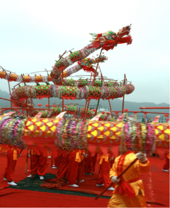 苗族人民崇尚龍舞文化,把龍作為苗族的圖騰。《山海經(jīng)·海內(nèi)經(jīng)》載:“南方…有人曰苗民,有神像人首蛇身”?!睹献?middot;騰文公》“堯之時…水逆行,泛濫中國,蛇龍居之”?!赌?middot;非攻下》“龍生于廟,三苗亡之時哭于市”,“史記《五帝·本紀(jì)》:三苗在江淮、荊州數(shù)為亂,舜歸而言于帝,帝曰:龍(帝堯二十五子之一)可使灌兜于崇山,以變南蠻;遷三苗于三危,以變西戎……”由此可見,龍是遠(yuǎn)古三苗先民“南蠻”“西戎”的統(tǒng)帥和精神領(lǐng)袖,也是苗族先民往南遷徙安居的守護(hù)神。苗族的先民把“龍神”尊崇為有呼風(fēng)喚雨、主宰水陸生靈的神圣,至今已有四千八百年的歷史。他們認(rèn)為有“龍神”護(hù)佑會風(fēng)調(diào)雨順、五谷豐登。
