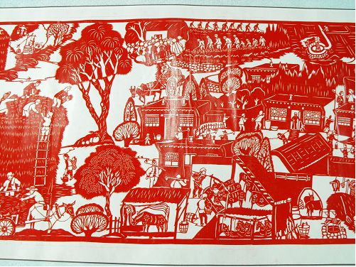 2、達(dá)拉特紀(jì)事剪紙的歷史價(jià)值很高,《農(nóng)民紀(jì)事圖》上卷記載了從建國(guó)到現(xiàn)在農(nóng)村的發(fā)展變化,在作品中我們看到了很多瀕臨失傳的農(nóng)村生產(chǎn)生活工具和生產(chǎn)方法,也能看到黨和國(guó)家在每一年出臺(tái)的各項(xiàng)惠農(nóng)利民政策,對(duì)于研究歷史具有重大的文獻(xiàn)價(jià)值。