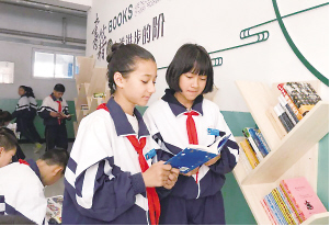 澤普縣五中學生在讀書角閱讀書籍。