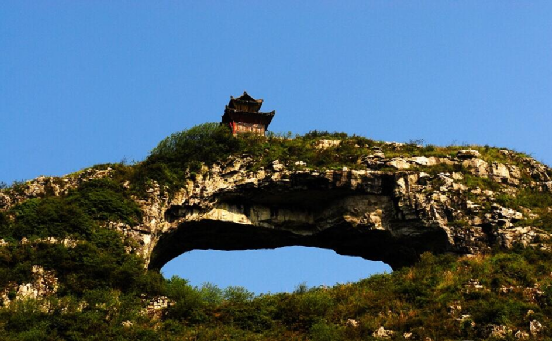 仙橋山位于貴州甕安縣城西南5公里的仙橋村,雄峙于南北伸展的長嶺之巔。山頂有一長方形穿洞,遠望似一面中天明鏡,又若仕女發(fā)髻上的一匹玉簪。民間傳說,那高懸的“橋洞”,是神通廣大的仙人張三豐發(fā)怒時一拳擊穿的。站在“橋”下仰望“橋”頂,如巨粱橫亙天際,青崖黛壁,輝映云天。天衣無縫的“橋身”和兩邊的“橋墩”,渾然一體,構成跨度約40米,寬20米,高約35米的“橋拱”?!皹蚬啊北泵娴摹皹蚨铡蹦_有形狀各異的石洞,曲徑相通。洞壁有形似人腳印石凹,傳說是仙人張三豐到此云游留下的足跡。