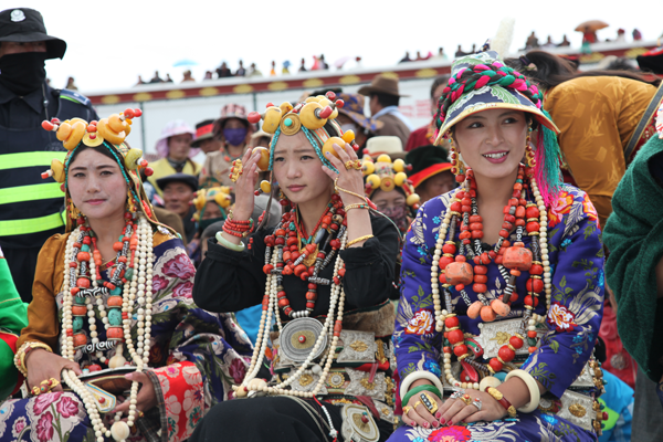 甘、青、川的藏族男子非常講究腰飾,有財力的男子一般都有一條鑲有僅、銀、玉的寬皮腰帶,腰帶上還掛有裝飾性的小刀、火鐮等。青海玉樹地區(qū)的婦女裝追求華麗,內(nèi)衣外袍色彩艷麗,綢緞腰帶留長飄帶,頭、頸、發(fā)、腕、指和腰佩有金、銀、玉、珊瑚、瑪瑙等珍貴飾品,一套豪華女裝價格不菲。因此有諺語:“男人的財富系在腰上,女人的嫁妝穿在身上”之說。云南藏區(qū)的女裝上身穿長袖彩綢衫,外著無袖大襟長袍,長袍領口、襟邊和下擺鑲有錦緞,色彩艷麗。云南一些藏區(qū)的女子喜歡穿百褶裙,顯示出女性的優(yōu)美身材。西藏工布地區(qū)的女裝顯得簡約,先穿有袖內(nèi)衣,再將氆氌拚縫成大片,中間挖一圓口,穿時將頭伸進圓口兩端垂與胸背,再束腰帶即可。藏族婦女的頭飾也很多,有碎辮的、有戴頭巾的,有盤發(fā)的,西藏山南地區(qū)的巴珠最有特點。巴珠是三枝狀,平系于頭頂兩枝向前,將分梳的兩條發(fā)辮分別盤于兩枝上。其上部還有一弓形物,與三枝狀兩端連接,上系絲織品,邊緣鑲珍珠、珊瑚等。女子13歲戴巴珠,象征已經(jīng)成人。金邊帽也很有特色,藏區(qū)的男女都戴。帽型為桶狀,周邊鑲織錦,內(nèi)有四片耳片,兩大兩小,天冷時放下耳片護耳。狐皮帽形似倒掛的金鐘花,以布作底層,再縫上狐貍皮,帽后有兩條長飄帶。男帽稍高,女帽較低。