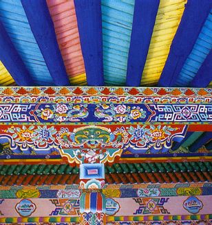 柱頭裝飾包括柱頭、斗拱、大梁等部位的雕刻、彩繪。在藏族居室中柱子、橫梁位置顯要,因此對(duì)這部分的裝飾在整個(gè)室內(nèi)裝飾中至關(guān)重要。無論高雅精致的殿堂還是普通百姓的民居都充分認(rèn)識(shí)到這一點(diǎn),進(jìn)行合理裝點(diǎn)以求莊嚴(yán)、堂皇、舒適的效果。就拿寺廟集會(huì)大堂的柱頭、橫梁來講,裝飾十分考究。天花板下的椽子木頂端整整齊齊地、略有間隔地排列在大梁上方,用彩繪的辦法進(jìn)行裝點(diǎn)。椽子至大梁之間夾著兩道橫杠,其上道用累卷疊函凹凸方格木雕處理,下道橫杠用蓮花瓣依次排列的雕刻或彩繪完成,這種裝飾是約定俗成的,上下圖案不能隨意調(diào)換。橫梁上的裝飾大多采用填充連接長(zhǎng)方格來進(jìn)行。橫梁表面劃分大小等同的長(zhǎng)方格,這些連接的長(zhǎng)方格內(nèi)或填寫梵文經(jīng)文,或繪各種花卉,用這樣的手段裝飾大梁。柱頭與橫梁之間是斗拱,藏族建筑對(duì)斗拱的裝飾非常講究。斗拱分兩層,上為長(zhǎng)弓,下為短弓。斗拱長(zhǎng)短兩弓本身形狀要精心雕摟,其表面也用雕刻著色的辦法加以渲染,以求良好的裝飾效果。斗拱裝飾有簡(jiǎn)有繁,最簡(jiǎn)單的斗拱形狀為梯形,這種不加任何雕飾的斗拱多見于底層的儲(chǔ)存室內(nèi)。而寺廟建筑大堂、佛堂之類重要殿堂內(nèi)的斗拱是經(jīng)過精心雕鏤的藝術(shù)品,尤其是斗拱長(zhǎng)弓形狀千姿百態(tài),通常見得較多的有祥云狀,此外還有各種花瓣?duì)?,其裝飾效果相當(dāng)強(qiáng)。除了斗拱形狀的雕刻外,表面上雕刻各種圖案獲得錦上添花的效果。長(zhǎng)弓中心雕刻佛像,兩邊及邊緣雕刻祥云、花卉、整個(gè)斗拱表面顯得飽滿、大方。柱子、柱頭也是裝點(diǎn)的一個(gè)良好的空間,柱子形狀有圓有方,也有部分多角柱。柱子最上面的部位或雕或繪花瓣,在下是長(zhǎng)城箭垛式圖案,這兩樣圖案的下面是短簾垂鈴式圖案,所有柱頭裝飾圖案基本上按此模式制作。除了雕鏤精細(xì)的寺廟大殿柱頭大梁裝飾以外,大量的柱頭裝飾見于藏族民居室內(nèi)。民居室內(nèi)柱頭大梁裝飾的基本走向、風(fēng)格與寺廟裝飾設(shè)有大的區(qū)別,彩繪圖案、顏色運(yùn)用、布局結(jié)構(gòu)除了個(gè)別外,與寺廟裝飾相同,只是民居室內(nèi)柱頭大梁裝飾多半是彩繪,幾乎見不到雕刻,這是經(jīng)濟(jì)條件所限呢還是等級(jí)待遇不同不得而知。兩者除了裝飾上的簡(jiǎn)繁區(qū)分之外其余部分很好地保持了藏民族建筑風(fēng)格的一同性。