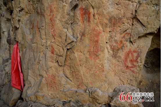 同時,在金山洞壁上的清代壁題也數(shù)量眾多,既有題詩,又有紀事,還有祝文,分別題于清乾隆、道光、咸豐年間。明顯可見“貴州貴陽府”和“貴陽府廣順州”等字樣。還有1949年以后的毛主席語錄,均以赭色書寫。據(jù)說時至今日,仍有村民在巖下洞口焚香秉燭,寄拜巖神,祈禱康健?,F(xiàn)在在巖石上還能看到祈福的紅布和被煙火熏黑的巖洞。
