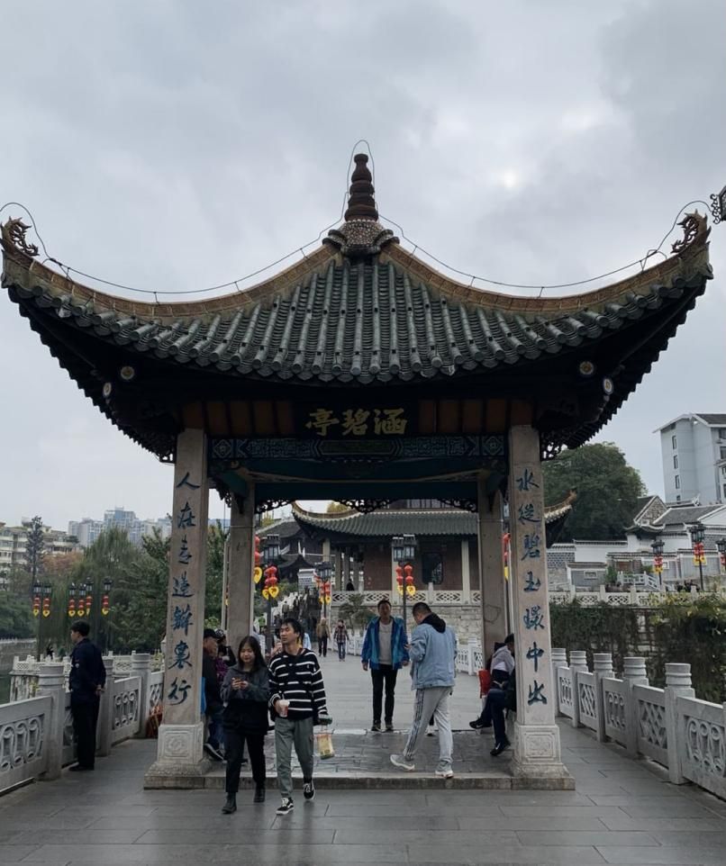 第二部分是甲秀樓。甲秀樓為三層三重檐四角攢尖頂穿斗式木結構建筑,面闊三間,高約22.9米,紅欞雕窗,朱梁碧瓦,白石巨柱托檐,雕花石欄相護。甲秀樓歷來為文人墨客雅集之處,留下碑記、丹青、詩聯(lián)甚多,其中以清代田雯《重修甲秀樓碑記》、畫家鄒一桂《山水覌我圖冊—涵碧潭》、楹聯(lián)大家劉韞良《甲秀樓長聯(lián)》最具代表。