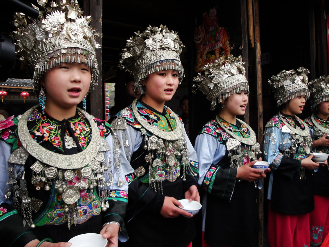 攔路酒。 苗族人熱情好客,在進(jìn)苗寨途中設(shè)有“攔路酒”。一般有三、五道,最多時(shí)有十二道,如果客人酒量尚淺,只怕沒(méi)進(jìn)寨門,先醉倒了。